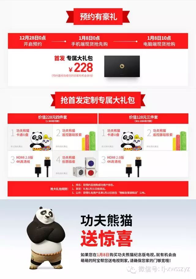 “鲸”喜叠加,首批2000名预约的铁杆用户还将额外获赠价值228元的阿宝首发神秘新年礼。12月28日即刻开启功夫熊猫定制版电视全网预约,并将陆续在京东、天猫、官网等网络平台登陆售卖。