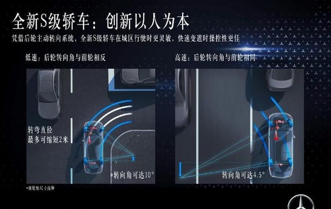 根据车速和转向角的具体情况,系统可以令后轮与前轮保持相同或相反的方向转动。当车速低于60公里/时,前后轮转向相反,后轮转向角度变大,转弯直径因此最多可缩短2米,令长轴距的S级轿车的转弯直径小于11米,车辆转向灵敏性大为提升,泊车时效果显著。