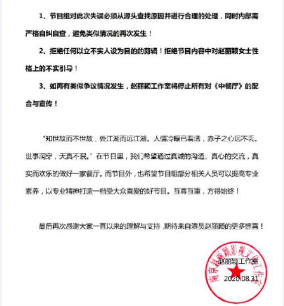 官微道歉半小时,赵丽颖工作室发表声明,历数赵丽颖参加《中餐厅4》的缘起和心路历程,并严正声明:其一,需要节目组彻查处理此次失误,内部自纠自查;其二,拒绝任何以不实人设为目的的剪辑;其三,再有类似争议,赵丽颖工作室将停止对节目的配合与宣传。基本“盖章”了节目组之前的恶意剪辑和引导。