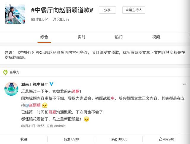 “因为标题内容审核不仔细,导致大家误会。初版战报中,所有截图文章正文内容,其实都是支持赵丽颖。”不久后,官微删除此版战报,并向赵丽颖致歉——不过这份“致歉”不仅没有节目组盖章,也不是格式正式的声明,还有被网友称之为“茶艺表演”的娱乐化表达:“都怪眼花看错了,马上重新配眼镜「委屈」”。