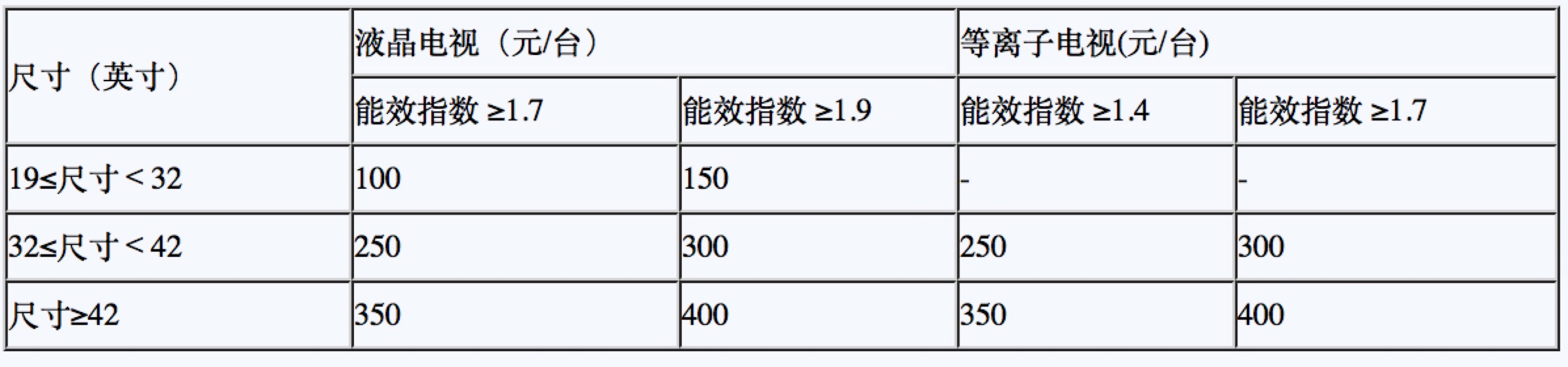 据2012年颁布的节能补贴政策规定的高效节能平板电视推广财政补贴标准,不同尺寸以及能效,所给的补贴不尽相同。