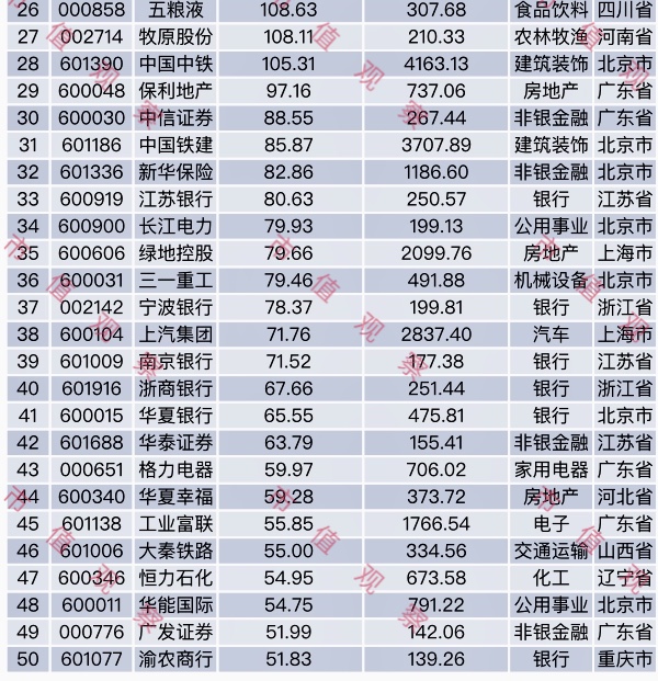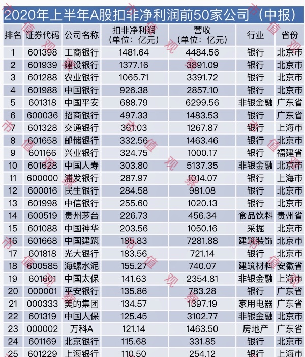 此外,扣非净利润按照从高到低,分别是中国建筑(601668)185.83亿、光大银行(601818)183.56亿、海螺水泥(600585)155.27亿、中国太保(601601)141.63亿、平安银行(000001)135.86亿、美的集团(000333)134.57亿、中国人保(601319)125.45亿、万科A(000002)121.14亿、北京银行(601169)115.68亿、上海银行(601229)110.50亿、五粮液(000858)108.63亿、牧原股份(002714)108.11亿、中国中铁(601390)105.31亿、保利地产(600048)97.16亿、中信证券(600030)88.55亿、中国铁建(601186)85.87亿、新华保险(601336)82.86亿、江苏银行(600919)80.63亿、长江电力(600900)79.93亿、绿地控股(600606)79.66亿、三一重工(600031)79.46亿、宁波银行(002142)78.37亿、上汽集团(600104)71.76亿、南京银行(601009)71.52亿、浙商银行(601916)67.66亿、华夏银行(600015)65.55亿、华泰证券(601688)63.79亿、格力电器(000651)59.97亿、华夏幸福(600340)59.28亿、工业富联(601138)55.85亿、大秦铁路(601006)55.00亿、恒力石化(600346)54.95亿、华能国际(600011)54.75亿、广发证券(000776)51.99亿、渝农商行(601077)51.83亿。