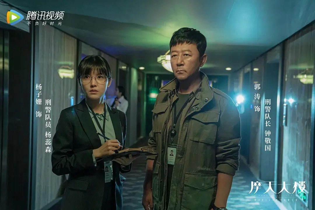 面对这些极致化的角色和过于跌宕的故事情节,《摩天大楼》选择用两个角色作为平衡。故事开篇以郭涛饰演的老警察钟敬国和杨子姗饰演的菜鸟警察杨蕊森的视角切入,由杨子姗来寻找线索,郭涛来点明套路,两个警察一边相互打配合,一边带领观众共同探索谜底。