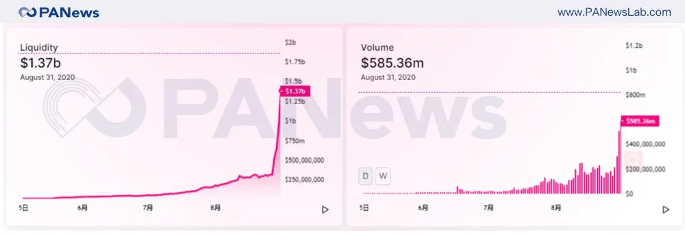 另一个有代表性的流动性挖矿项目SushiSwap更以颠覆Uniswap为目标。在这之前,Uniswap是用户量最多、交易量最大的去中心化交易所。