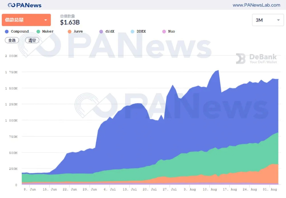 8月份,以太坊网络中的去中心化借贷市场并没有继续快速增长,借款量增加了20.8%。借款总量排第一的Compound,业务并没有什么增长,在总借款中的比例下降。由于DAI在去中心化应用中的需求,Maker中的借款量仍在增长。另一个借贷平台Aave,本月借款量的占比由7.37%升至17.82%。据TheBlock报道,Aave向英国金融服务监管局申请的电子货币机构牌照获得了通过,使得Aave的用户可以通过法币购买Aave生态中的稳定币和其它资产。