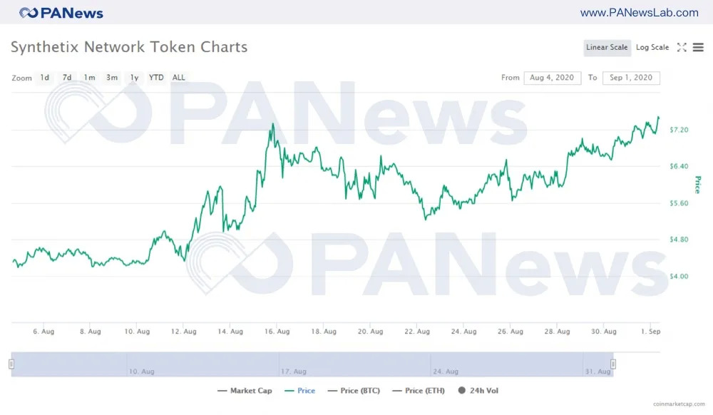 合成资产代表项目Synthetix的原生代币SNX在本月依旧取得了不错的成绩,价格从4美元涨至7.4美元。作为一种已经被广泛认可的DeFi代币,SNX在流动性挖矿中被大量使用,推高了SNX的价格。由于Synthetix的成功,市场上也出现了更多的合成资产项目,比如Linear Finance和AXIS等。