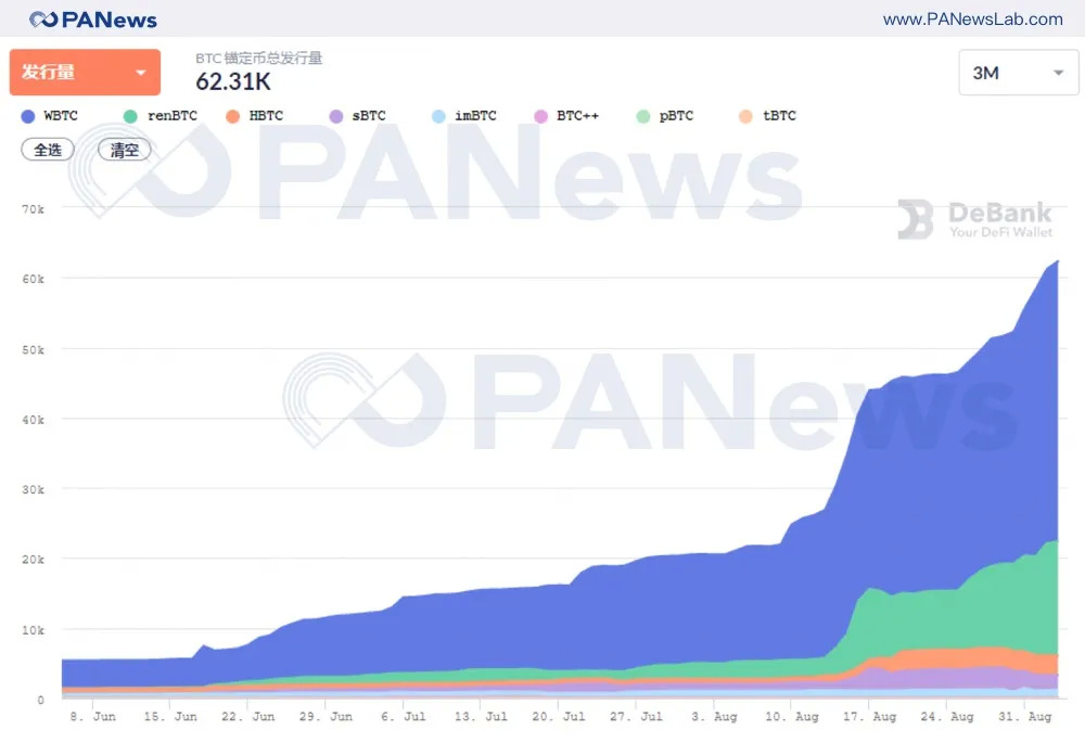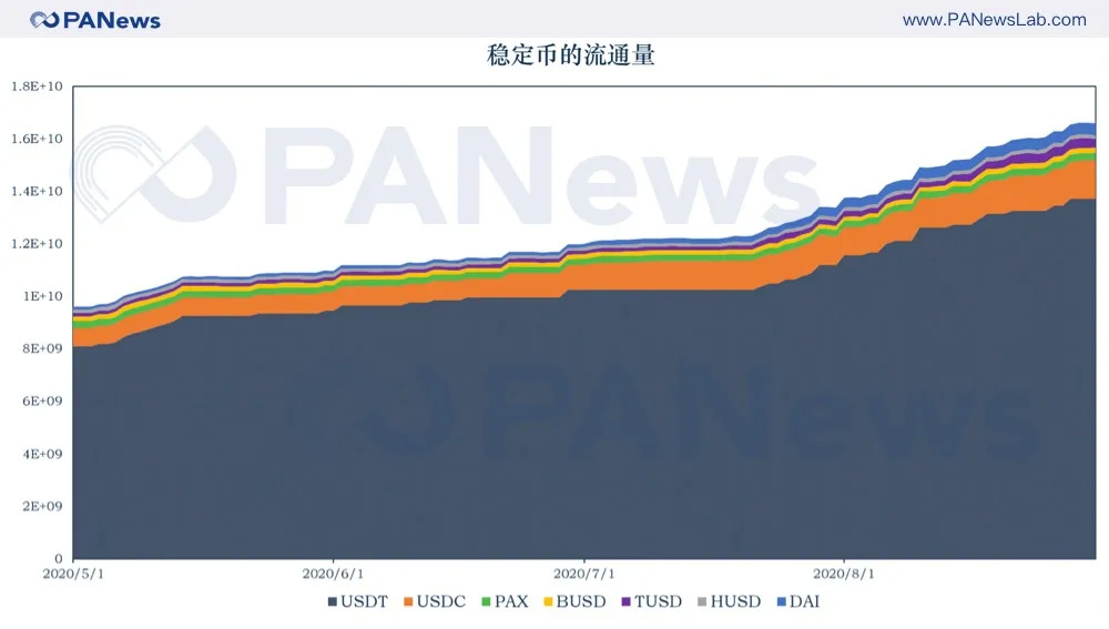 8月份,稳定币的流通市值达到165.9亿美元,增长了31.86亿美元。本月USDT恢复了较快的增发速度,流通量增加25.2亿。USDC、TUSD、DAI的流通量分别增加3.94亿、1.32亿、0.8亿。