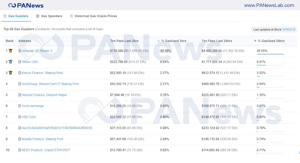 DeFi市场的火热也并非只有好处,以太坊上的矿工费已经超过比特币,并创下新高。以前一笔普通的转账只要不到1美元,现在可能需要20美元。网络拥堵使以太坊的用户体验大大降低。而这些也都和流动性挖矿有关。从Etherscan的数据可以看到,过去24小时使用gas费最多的地址中,有4个为流动性挖矿协议的合约地址。另外,因为流动性挖矿使用的代币已经由单纯的稳定币、以太坊等转向了LP代币,Uniswap作为重要的LP代币提供者,Gas费大增。