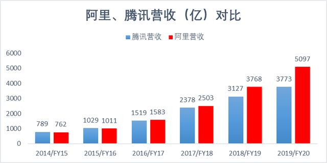 当年,阿里巴巴以1583亿元总收入力压腾讯的1519亿元,首次在营收层面完成对企鹅的超越。随后,双方差距越来越大,到2019年(阿里2020财年)时,阿里的收入规模已经比腾讯高出的35%。