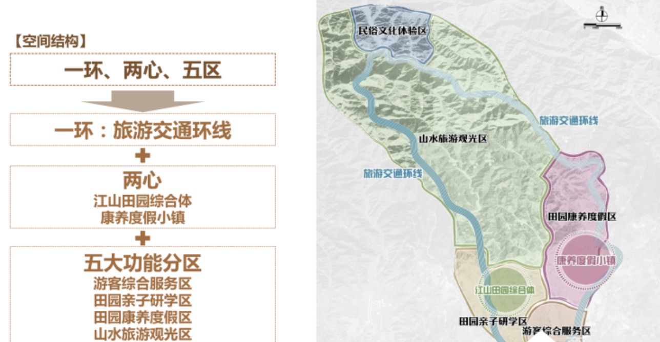大江山文化旅游度假区项目位于商州区腰市镇,是商州区委区政府为实施乡村振兴战略而策划确定的城乡融合发展的重点招商引资建设项目。该项目充分依托秦岭南麓特有的生态资源、自然景观、地理区位优势和商洛“康养之都”的品牌优势,深入挖掘商州乃至商洛民间艺术、传统工艺、特色产业、饮食文化,进一步提升和发挥江山 4A 级景区的辐射带动作用,在腰市区域打造集休闲旅游度假、田园生态康养、民俗文化体验、现代文化创意、产业整合升级、一二三产融合的复合型城乡融合发展项目,助力商州区域乡村振兴战略实施。