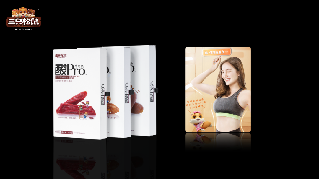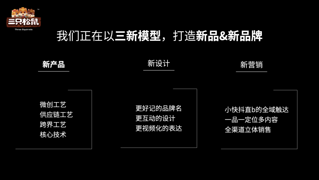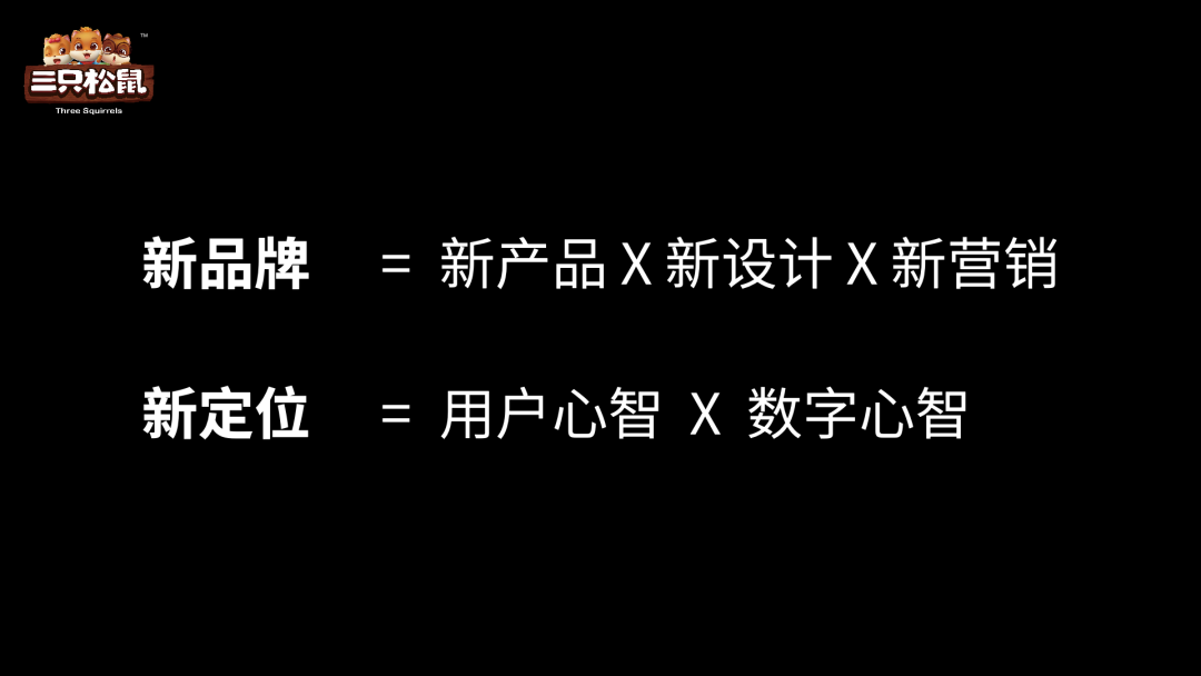 对于这个问题,三只松鼠的答案是一个公式——新品牌=新产品x新设计x新营销。这也就是我们在内部提的「三新转型战略」,即以新的工艺实现新的产品,以新的设计体现新的好感,以新的媒介实现新触达,每一层逐级叠加放大。