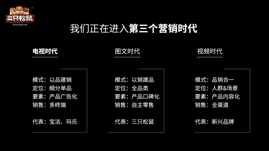 图文时代(代表案例为三只松鼠):以销建品,即通过互联网图文形式先销售出产品,然后再形成品牌。