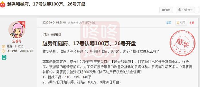 根据短信消息,项目于9月17日开始诚意登记,冻资100万,9月26日开盘。