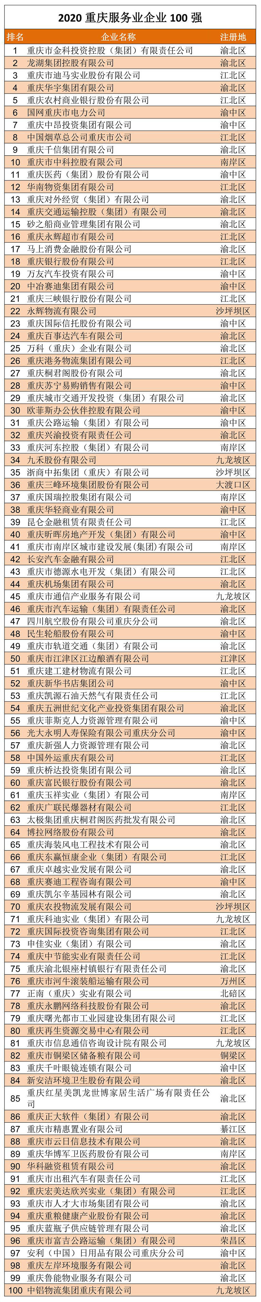 9月4日,重庆市企业联合会召开了2020重庆100强企业发布会,同时发布的还有重庆制造业企业100强和服务业企业100强榜单。