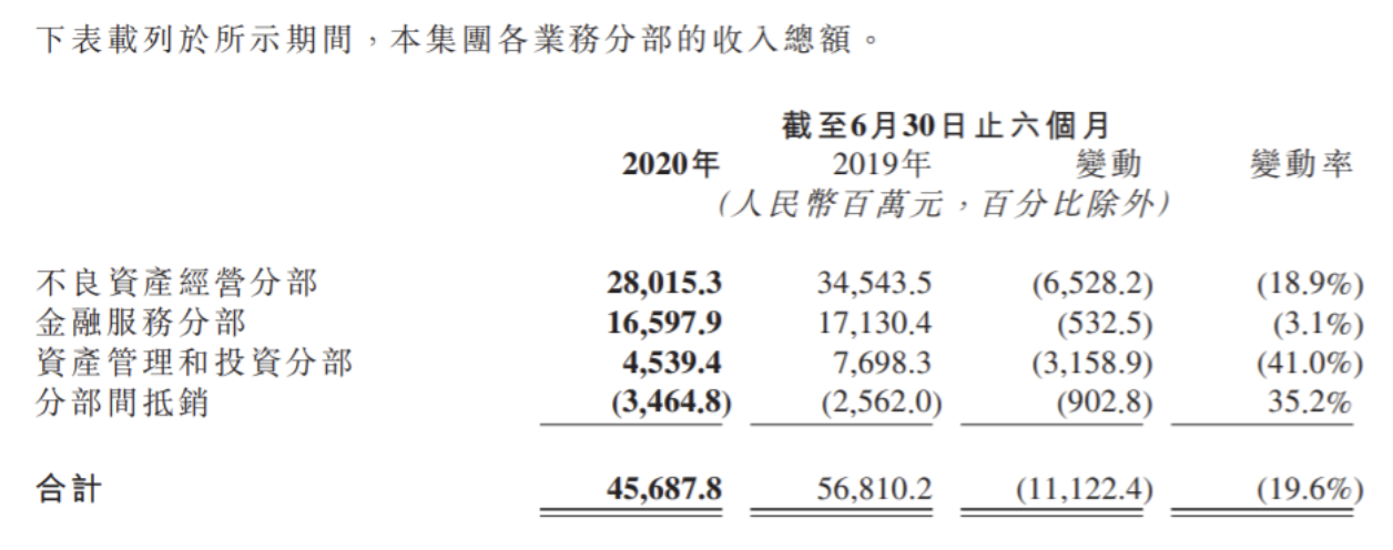半年报显示,中国华融业务主要划分为不良资产经营分部、金融服务分部、资产管理和投资分部。不良资产经营分部主要包括中国华融不良债权资产经营业务、商业化买断的政策性债转股资产经营业务,子公司开展的不良资产经营业务、基于不良资产的特殊机遇投资业务以及基于不良资产的房地产开发业务,以及本集团的市场化债转股业务;金融服务分部主要包括证券及期货业务、金融租赁业务、银行服务业务、消费金融业务;资产管理和投资分部主要包括信托业务、私募基金业务、国际业务及其他业务。
