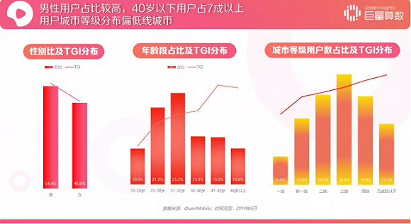 西瓜视频是男性用户为主,25-30和30-35两个年龄段的用户占比最高,合计占比达到46.2%,地域分布的特征上以三线城市及以下为主,占比达到58.6%,用户下沉明显,目前还没有形成一定的社区氛围。