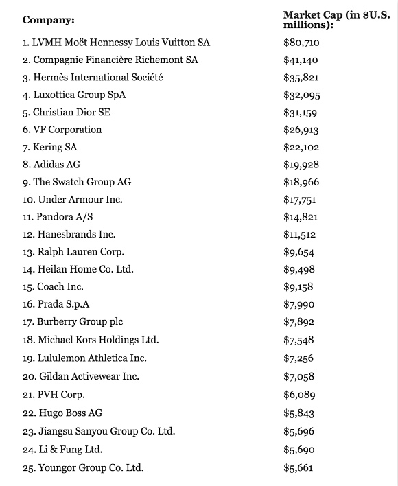 令人意外的是,前 25 强中出现了不少中国面孔。总部位于江苏江阴的海澜之家以 94.98 亿美元的市值排在第 14 名,处在 Ralph Lauren 和 Coach 之间。同样位于江苏的服装生厂商江苏三友集团也跻身排行榜;在香港交易所上市利丰有限公司(Li & Fung)紧随其后,位列第 24 名;榜单的最后一名雅戈尔集团也来自中国。1979 年以服装起家的这家宁波公司如今市值达到 56.61 亿美元。