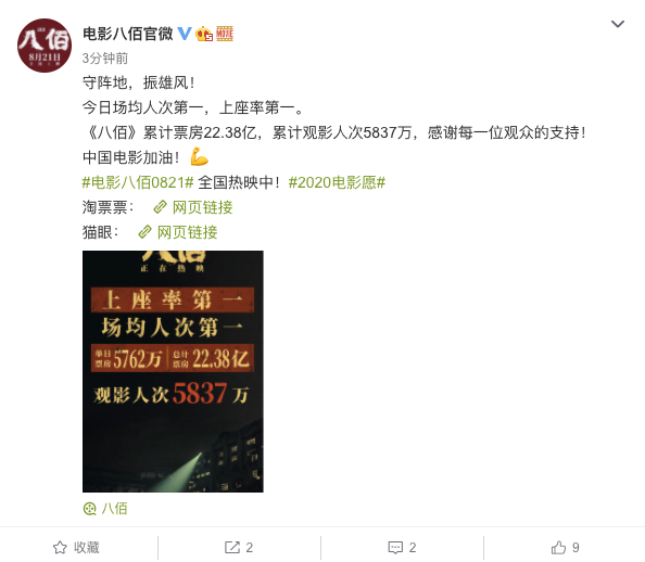 电影《八佰》单日票房5762万元,累计票房22.38亿元