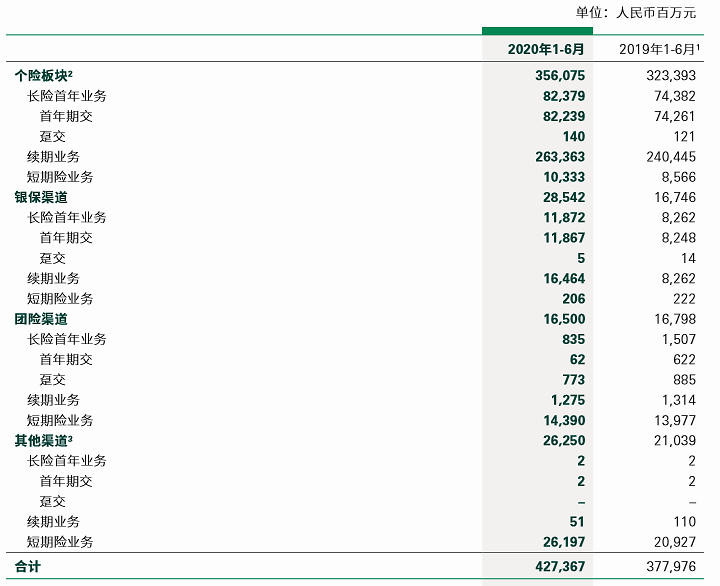 此外,在今年上半年,中国人寿持续聚焦价值提升,加快转型变革,公司根据“一体多元”发展体系对渠道披露进行调整,划分为个险与多元业务两大板块。