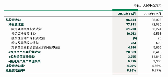 2020年上半年,中国人寿实现净投资收益773.91亿元,较2019年同期增加53.61亿元,同比增长7.4%。受年内利率大幅下行、持仓上市股票股息派发延后等影响,净投资收益率为4.29%,较2019年同期下降37个基点。