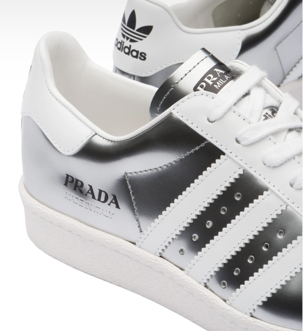 虽然是联名,但从外观上看主要特征还是阿迪达斯的Superstar,在鞋侧空白处则印有PRADA和Made in Italy的品牌标识。