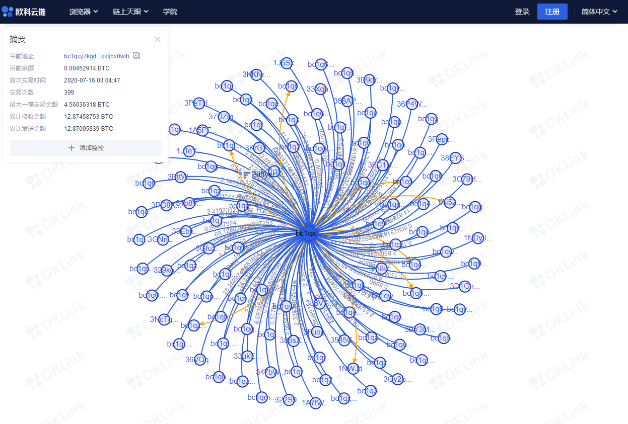今年6月,欧科云链核心产品OKLink区块链浏览器添加地址标签以保障用户资产安全,间隔不到3个月,9月1日,OKLink正式发布上线“链上天眼”功能,基于对海量链上数据的深度分析和持续更新,该功能目前可以为用户提供交易图谱、地址分析以及链上监控功能。