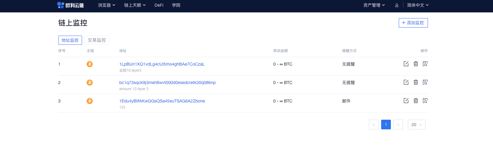 链上监控方面,该功能分为“地址监控”和“交易监控”两种,前者可以监控某些地址的动态,而后者则可以用来监控某笔交易中涉及到的资金。将需要监控的地址或交易添加到“链上监控”的列表中,设定好余额变动范围,就可以在资金发生转账时获取到第一时间的邮件通知,免除人力持续监控的烦恼。