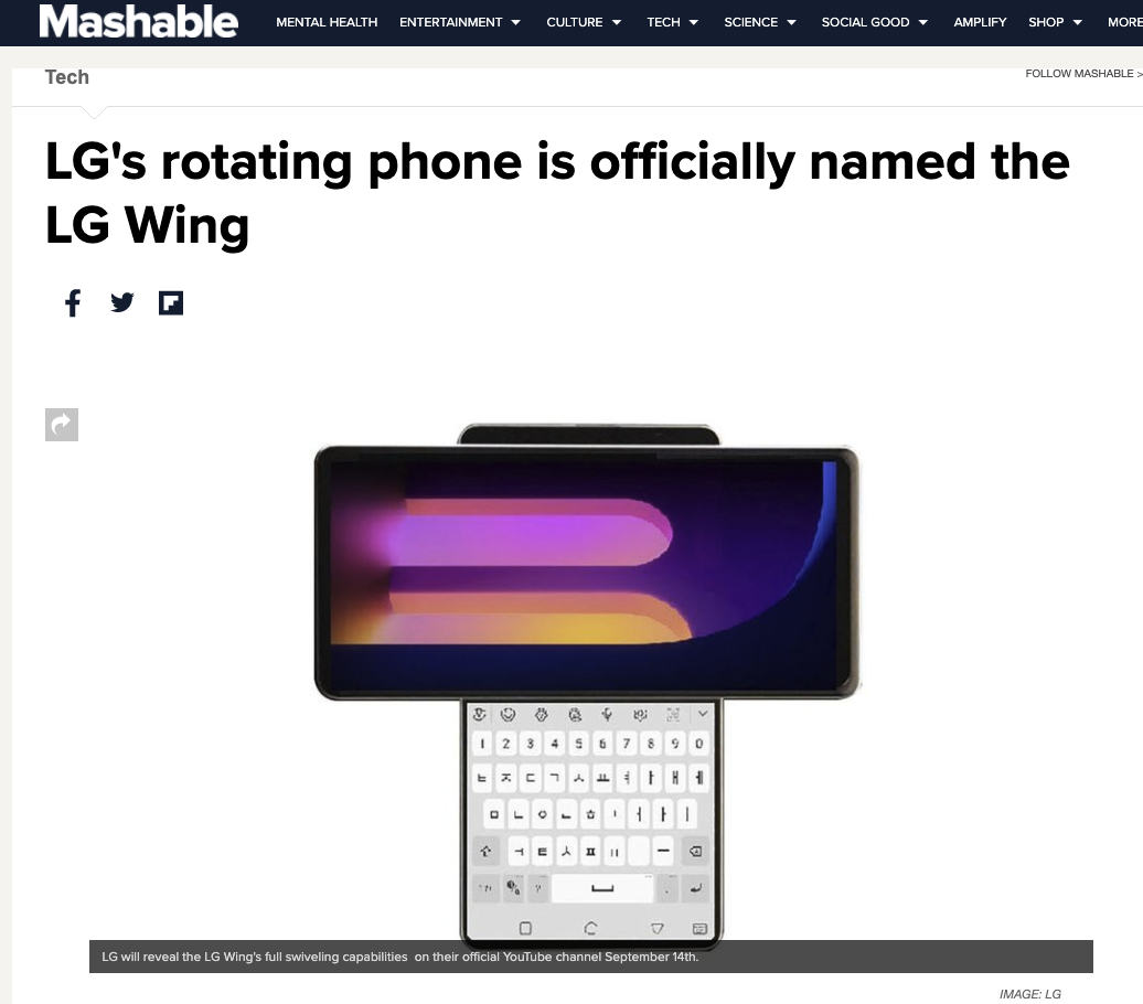 7日消息,据Mashable报道,经过几个月的传言和猜测,这款新的LG可旋转屏幕手机终于有了官方名称:LG Wing。