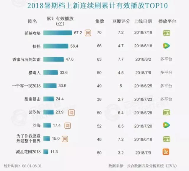 具体来看,2018年,上新连续剧中,热度排名TOP10的剧集作品,豆瓣均分仅达到5.51分。《延禧攻略》的豆瓣7.2和《香蜜》的豆瓣7.7,以及《为了你我愿意热爱整个世界》的豆瓣7.2分,是热度榜TOP10中为数不多的7分以上作品,达到6分以上的热播作品,也仅为一半。这意味着2018年的暑期档剧集市场,是“有热度、无口碑”的一年。
