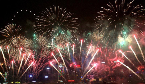 香港跨年烟花汇演在维港上空举行,各色烟花纷纷绽放。