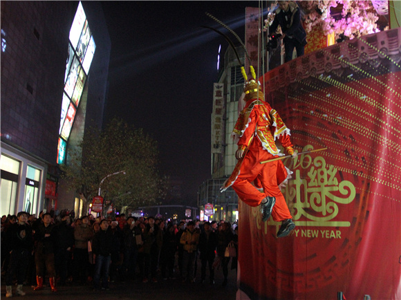 2015年12月31日,浙江省金华市,当天晚上,金华市区一百货商场专门从横店影视城请来威亚特技表演团队,在江北步行街——西市街上演真人版“金猴大闹天宫”,吸引众多市民纷纷前来新年祈福,迎接璀璨的2016年钟声的敲响。