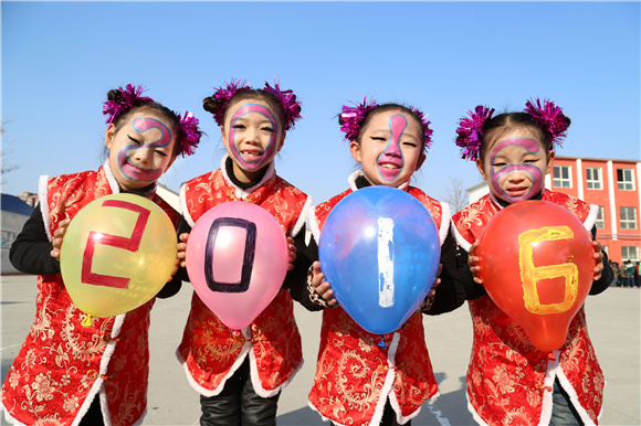 河南省温县西关小学几名学生在脸上写上“2016”字样,手持写有“2016”字样的气球,喜迎新年。