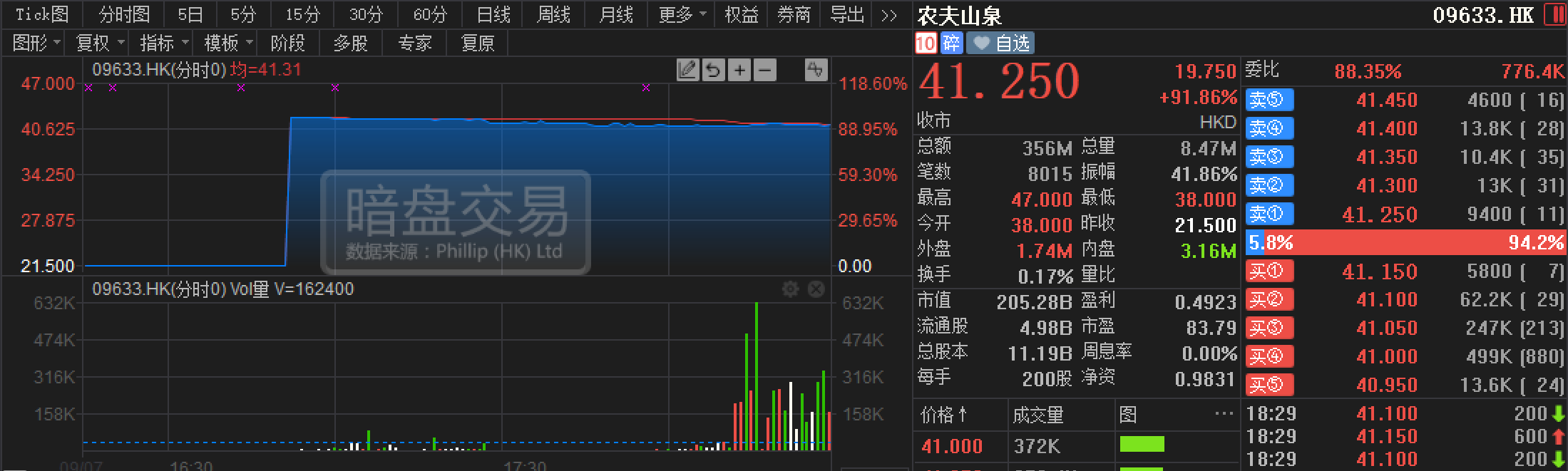 农夫山泉的招股定价为21.5港元,但暗盘刚启,捷利交易宝上撮合的报价,很快就已飙升至41.25港元一线,较21.5港元的增幅达91.86%,气势惊人。以此计算的话,农夫山泉的市值甚至可以接近4611亿港元。