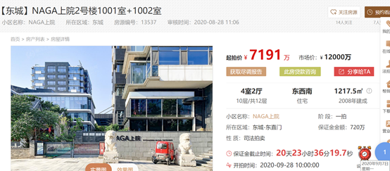 14年后,成龙所购买的2套NAGA上院已经价值过亿,但却面临将被拍卖的境况。瀚海法拍网显示,成龙购买的NAGA上院2号楼1001室+1002室将于今年9月28日拍卖,起拍价7191万,已有7人预约看房。