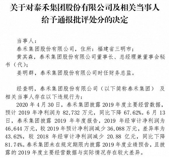 同日,因泰禾集团未在规定期限内披露2019年度业绩预告,且披露的2019年度主要经营数据与实际情况存在较大差异。深交所对泰禾集团、泰禾集团董事长、总经理兼董事会秘书(代)黄其森、时任财务总监姜明群给予通报批评的处分。