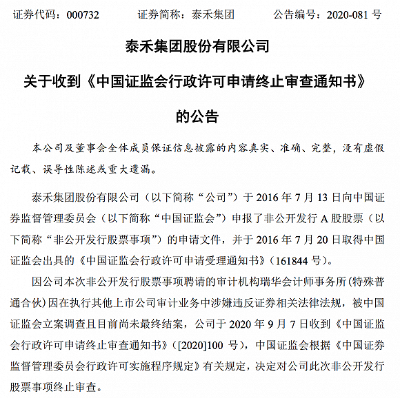其中,包括泰禾集团。泰禾集团在公告中表示,因聘请的审计机构瑞华在执行其他上市公司审计业务中涉嫌违反证券相关法律法规,被证监会立案调查且目前尚未最终结案,证监会决定对公司此次非公开发行股票事项终止审查。
