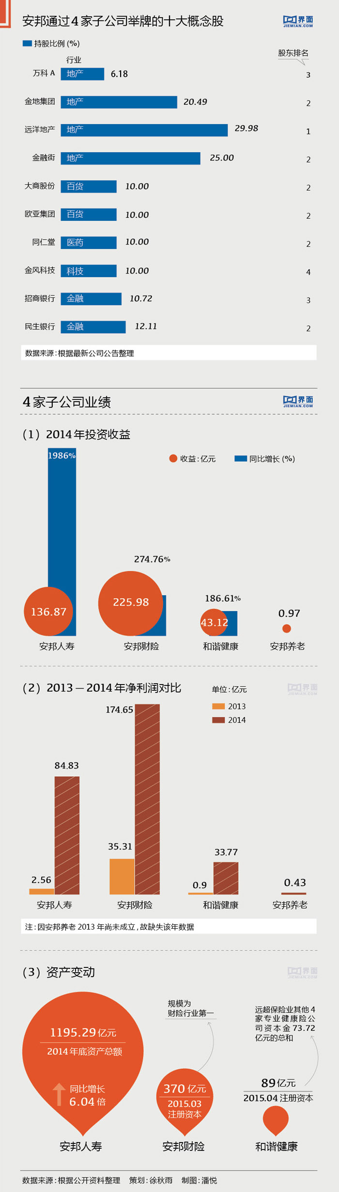 安邦人寿,虽然投资收益低于保费,但2014年总资产较2013年同比增长了6倍,其资产中长期股权投资同比增幅和占比均占首位——这意味着,安邦人寿在2014年进行了大量的长期股权投资活动。