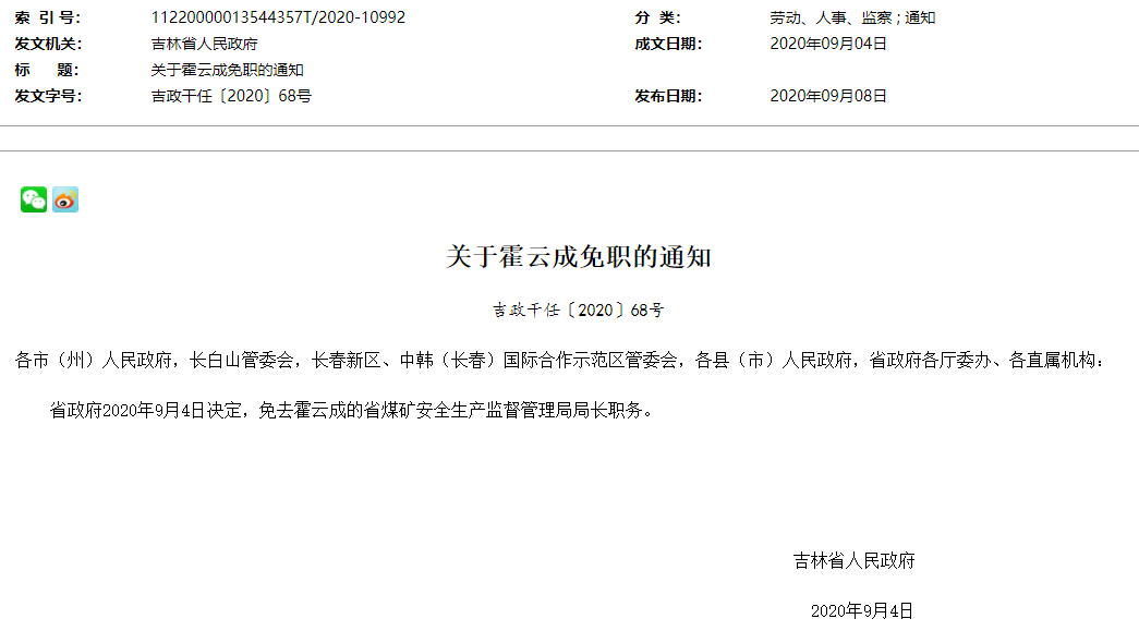 吉林省人民政府消息,吉林省政府2020年9月4日决定,免去霍云成的省煤矿安全生产监督管理局局长职务。