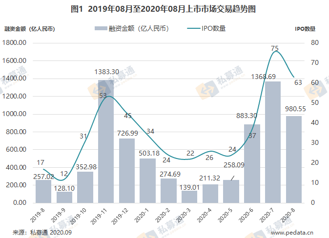 根据清科旗下私募通数据显示,2020年8月共有63家中国企业 在全球各交易市场完成IPO,同比上升270.59%,环比小幅下降16%。