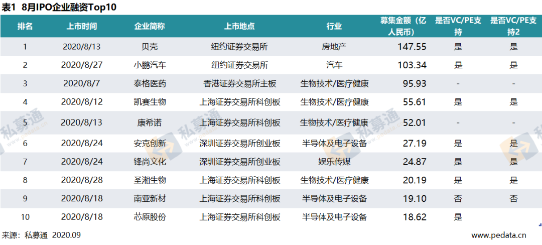对比2019年8月和2020年7月数据,中企IPO数量及融资额同比大幅上升,环比小幅下降,上市热情依旧高涨。从融资金额来看,TOP10的IPO企业总融资额累计564.41亿人民币,占本月总融资额的57.55%;其中贝壳排在首位,融资金额为147.55亿人民币;小鹏汽车以103.34亿人民币的融资金额位居第二;泰格医药在港交所主板二次上市,融资金额达95.93亿人民币,位居第三。此外,8月IPO企业TOP10中,有2家企业为A+H上市,7家企业获得VC/PE支持。