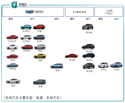 吉利汽车旗下有3个品牌:吉利、领克、几何。‘吉利’品牌定位经济型乘用车,覆盖轿车、SUV 和 MPV;领克品牌定位中高端乘用车,与主流合资车型直接竞争,是吉利实现高端突破的全新品牌;此外,吉利还推出了几何品牌,主推中高端纯电车型,目前主打车型为几何 A 与几何 C 两款车型。