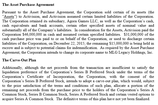 2015年12月21日,MLG董事会已经通过了动视暴雪的资产购买协议,同意以4600万美元的价格出售其大部分资产。MLG称根据《特拉华州普通公司法》,此次资产出售决定并没有征询所有股东的意见。次日,一些股东收到了MLG的致股东信。
