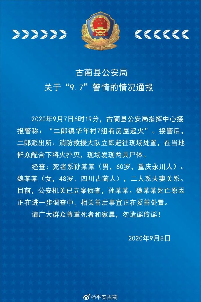 古蔺县公安局官方微博9月8日通报,9月7日接到报警称“二郎镇华年村7组有房屋起火”,将火扑灭后,在现场发现两具尸体,经查,两人系夫妻关系。警方已对此立案侦查,两人死亡原因正在进一步调查中。
