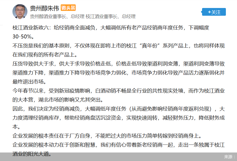 不过,朱伟针对枝江酒业第六条新政在个人社交账号做出回应称,将会关注网友评论,并适当作为参考借鉴。