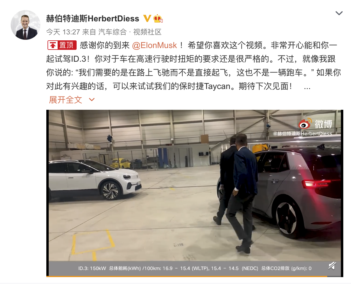 8日消息,微博认证为大众汽车集团管理董事会主席的大众集团CEO赫伯特·迪斯(Herbert Diess)在其个人微博发文称,非常开心能和马斯克一起试驾ID.3,并邀请其试驾保时捷Taycan。