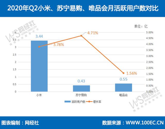 可以看出,小米用户量级较高,苏宁易购增速较快,唯品会增速疲乏。