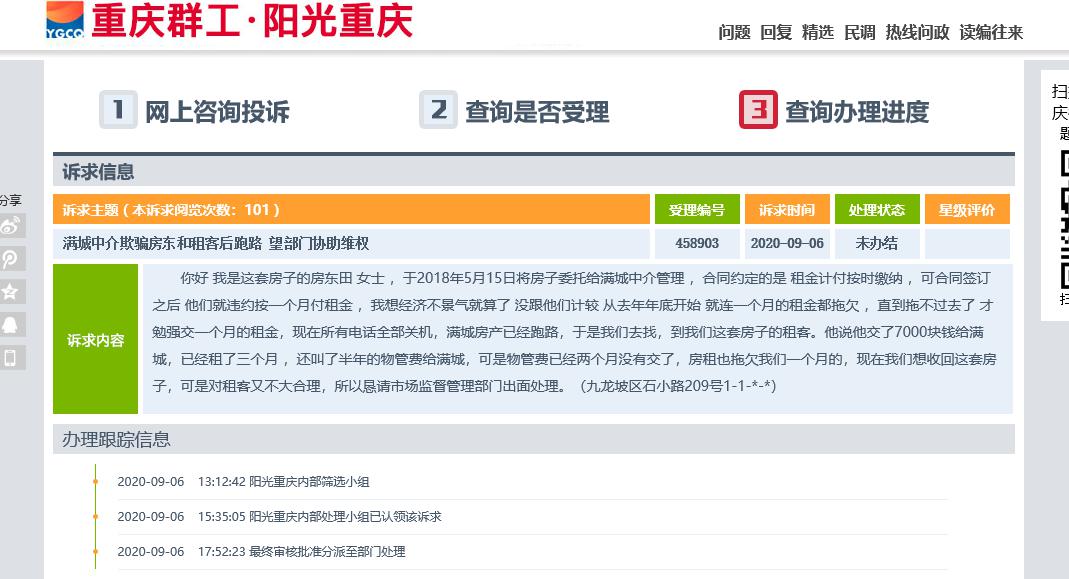 9月6日,房东田女士在阳光重庆平台上投诉,自己于2018年5月15日将房子委托给满城中介管理,从去年年底开始,满城开始拖欠租金。给满城房产方面打电话,却发现电话关机。于是,田女士找到租客,租客表示已交了7000块钱和半年物管费给满城。但田女士发现,满城不仅没按时将租金交给自己,还有两个月物管费也没交。