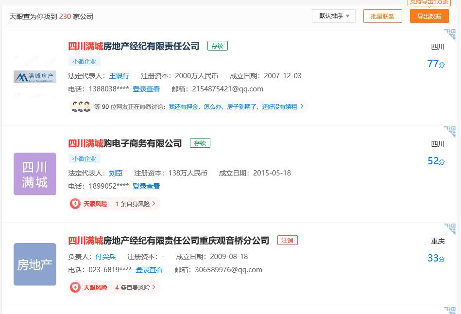 天眼查显示,四川满城房地产经纪有限责任公司的司法风险为223条,其中涉及的法律诉讼多为房屋租赁合同纠纷。