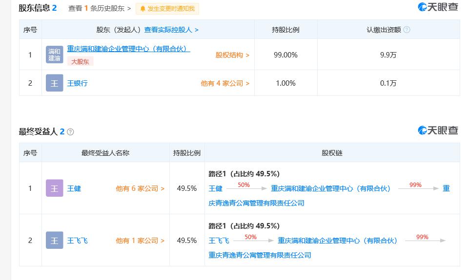 天眼查APP显示,四川满城房地产经纪有限责任公司重庆多家分公司负责人为付尖兵;重庆满励城房地产经纪有限责任公司法人代表也为付尖兵;四川满城房地产经纪有限责任公司法人代表王银行,则是重庆青逸青公寓管理有限责任公司的股东;重庆青逸青公寓管理有限责任公司的股东王飞飞,同时也是四川满城房地产经纪有限责任公司的股东。