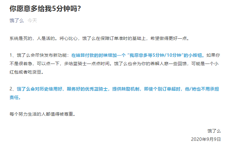 饿了么推出多等5分钟功能:历史信用好、服务好的优秀蓝骑士个别订单超时,不用承担责任